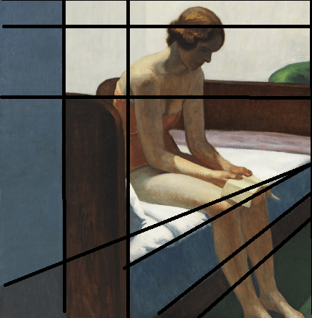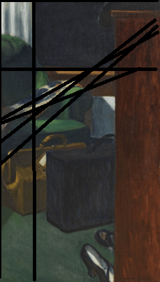 Planos de valor extremo: Hopper utiliza grandes bloques de valor muy alto (el blanco de la pared y las sábanas) frente a valores muy bajos (el vestido azul marino y el negro de las maletas). Esto crea una imagen muy estática y rotunda, casi como si el tiempo se hubiera congelado.