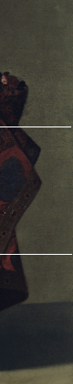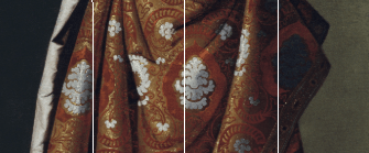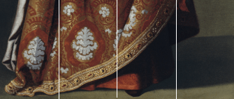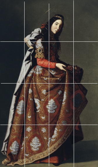 - Zona Inferior (La base): El tercio inferior está completamente ocupado por el volumen del vestido. Aquí, Zurbarán aplica la proporción áurea para que la falda no parezca un bloque pesado, sino una estructura ascendente que guía la mirada hacia arriba.