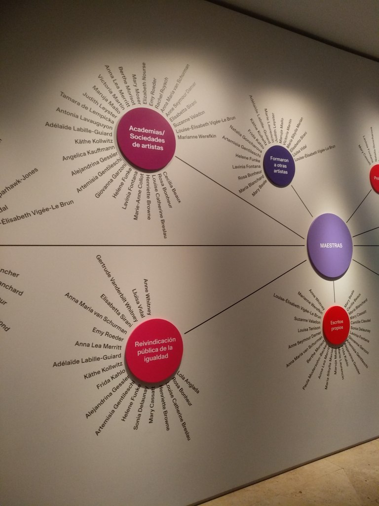 La exposición realiza un itinerario de las obras de las artistas mas relevantes desde finales del siglo XVI a las primeras décadas del siglo XX, dibujando ocho secciones significativas en el trayecto que recorrieron las mujeres en sus avances en la lucha hacia su emancipación. Se realiza un análisis comparativo de la unión de los periodos históricos, géneros artísticos y temas pintados como esencia principal que estructura la línea del recorrido de la exposición, certificando cómo las artistas plantean polémicas candentes de su tiempo, asentando sus reclamaciones y aportando nuevas representaciones y posiciones alternativas.