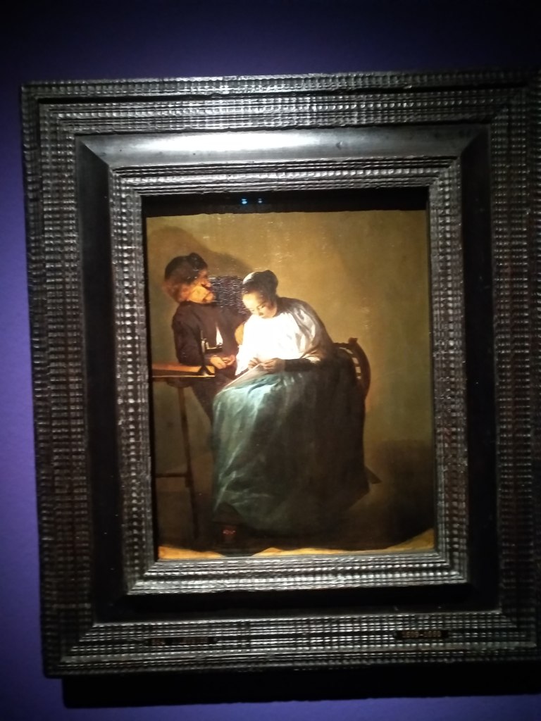 La mirada de Judit es de preocupacion y su mano en el hombro de la criada parece quererla contener, como turbada por un rumor exterior. La dirección de la mirada de ambas contradice la posición de sus cuerpos. Su concentración en un punto indefinido nos inquieta, no sabemos lo que va a pasar.