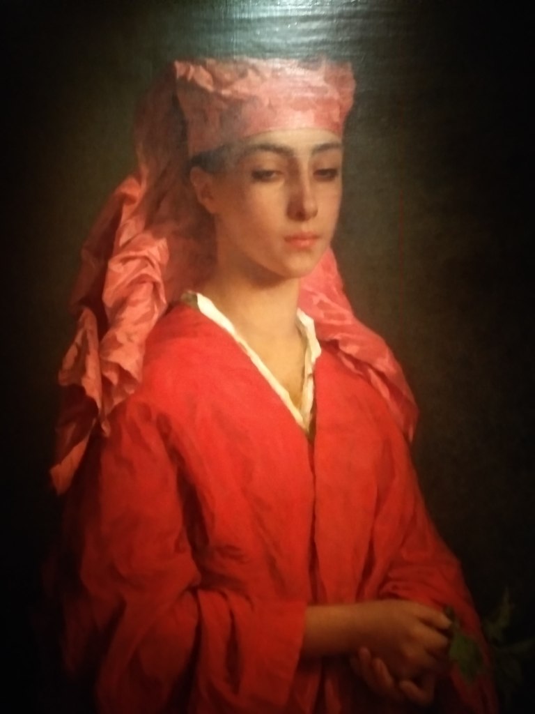 Algunas de sus danzas libres y sensuales pretendían rememorar los frescos de Pompeya, así la retrató la pintora como una vacante con el poder del vesubio al fondo. Banda roja en la frente para sujetar las hojas de Parra. Movimiento exagerado. Hizo hasta cuatro retratos de esta mujer que llegó a ser muy conocida en su época.