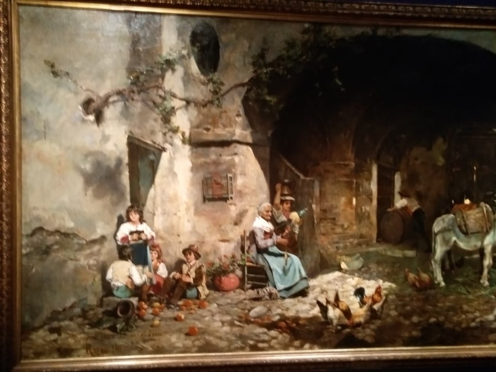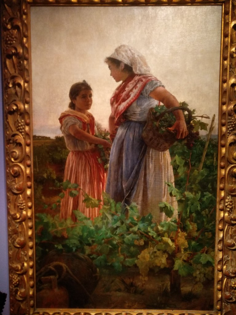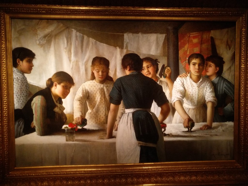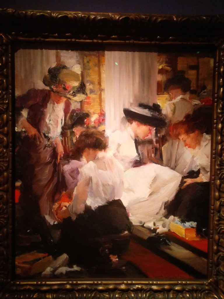 Pertenece a una familia de artistas. Toda su obra está impregnada de realismo, frescura y sensualidad, retratando la vida cotidiana punto en esta obra representa a un grupo de mujeres trabajadoras coma son 7 dispuestas en círculo lo que subraya una sensación de compañerismo, entendimiento y cordialidad. Unas trabajan coma otras charlan o contemplan la escena. Llama la atención la posición erguida coma ya que habitualmente era muy frecuente representar a los trabajadores con el cuerpo doblado asociado a la sumisión. Son figuras individualizadas, De hecho coma se ha localizado el nombre de todas las jóvenes que sirvieron de modelos. Hay detalles como el fogón del fondo coma y la flor fresca en un vaso de agua.