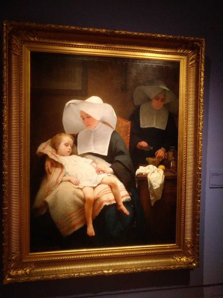 Su pintura está relacionada con el realismo coma y se especializó en pintura de género centrado especialmente en un enfoque poco convencional cómo fueron los temas de orientalismo coma y escenas de escolares. Acompañó a su esposo, diplomático francés coma a numerosos viajes, lo que fue muy importante para su formación artística con el descubrimiento de nuevos entornos. Representaba el Oriente Próximo de una manera menos sensacionalista coma aunque exótica coma y que sus contemporáneos. En sus pinturas el harén se muestra como un espacio para la interacción social entre las mujeres en oposición a un espacio de placer sexual para los hombres punto siempre dio prioridad a la mirada femenina. Su posición social y la influencia de su madre fueron fundamentales para su desarrollo como artista. Se han perdido muchas de sus obras. Especialmente se centró en retratos. Sus pinturas fueron atractivas y bien recibidas en Gran Bretaña Y Francia punto las escenas de género de monjas y niños fueron extremadamente populares en Gran Bretaña. Esta pintura fue identificada como una obra maestra, especialmente por su fuerte mensaje moral. Browne mostró un sentimiento y maternalismo extremos, que permitía al espectador simpatizar con estas monjas que cuidan a un niño. Recuerda a la tradición secular, documentada al menos desde la Edad Media, del servicio y cuidado de mujeres fuera del entorno familiar a enfermos y desfavorecidos. El cuadro se realiza 1 año antes de qué se profesionalizarse la enfermería, con la primera escuela laica de enfermería en El Mundo coma En Londres. Podemos observar en la mesa la preparación de los medicamentos, la luz, la sensación de falta de energía del niño y la dulzura de la persona que lo sostiene.