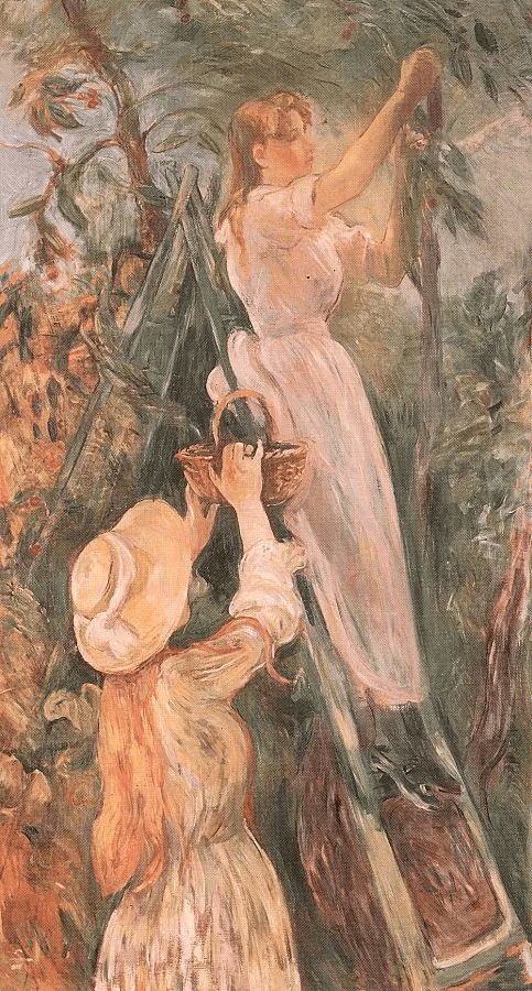 Fue una de las principales representantes del impresionismo y la primera mujer en acceder a su círculo. Obtuvo el respeto y reconocimiento público de sus colegas varones contemporáneos. Estuvo presente en todas las exposiciones impresionistas, excepto en una por la enfermedad de su hija. Pinto casi hasta el final de su vida punto muy amiga de manet se influenciaron mucho el 1 al otro y se terminó casando con su hermano. En su pintura predominan escenas desarrolladas en ambientes domésticos y de las personas que la rodean, muestra su entorno con gran naturalidad, la clase media francesa a finales del siglo 19. Al abandonar su hermana la pintura por el matrimonio, la tomó como modelo en numerosas ocasiones a ella y a sus hijos coma tanto en la casa como en el jardín. Morisot se hizo célebre por sus pinturas de mujeres en poses lánguidas que oscilan entre la melancolía y la ternura. Durante la realización de esta obra conversó frecuentemente con Renoir sobre el color, su influencia está en las pinceladas de colores morados, en el amarillo lleno de luz y en el rojo bermellón de las cerezas. Morisot utilizó 3 modelos para esta pintura, incluida su hija punto mientras las jóvenes posaban, morisot hacía varias versiones de bocetos en lápiz para estudiar el movimiento y la forma de los cuerpos, optando por colores pasteles. Las ramas del cerezo se mecen con el viento mientras las niñas mueven los brazos para recoger las cerezas que cuelgan oscilante. Se crea una atmósfera de ensueño, muy idealizada, un momento del gozo de la vida, un momento cotidiano, una estampa inocente. Las chicas ni se plantean que pueden ser observadas. Una muestra del vínculo con la naturaleza coma la amistad… Colaboración entre mujeres lejos de la idea de Eva y la serpiente.