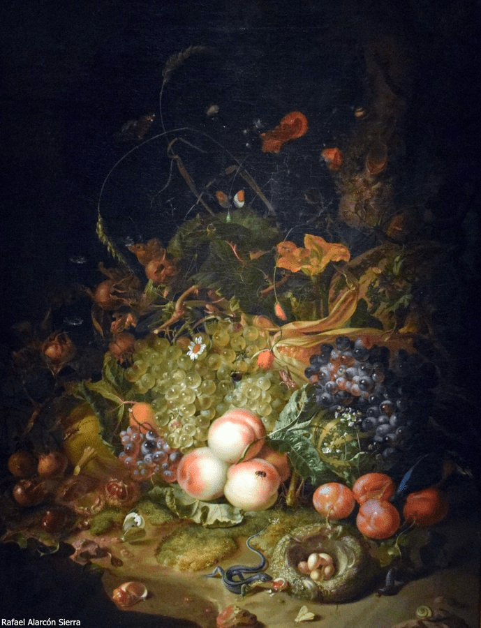 Rachel Ruysch. (Holandesa). «Frutas, flores, reptiles e insectos en la linde de un bosque». S. XVIII