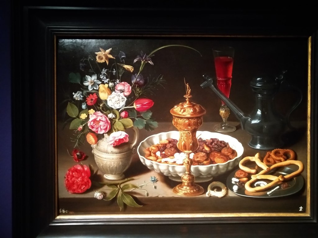 Clara Peeters (Belga). «Bodegón con flores, copa de plata dorada, almendras, frutos secos, dulces, panecillos, vino y jarra de peltre». Siglo XVII.